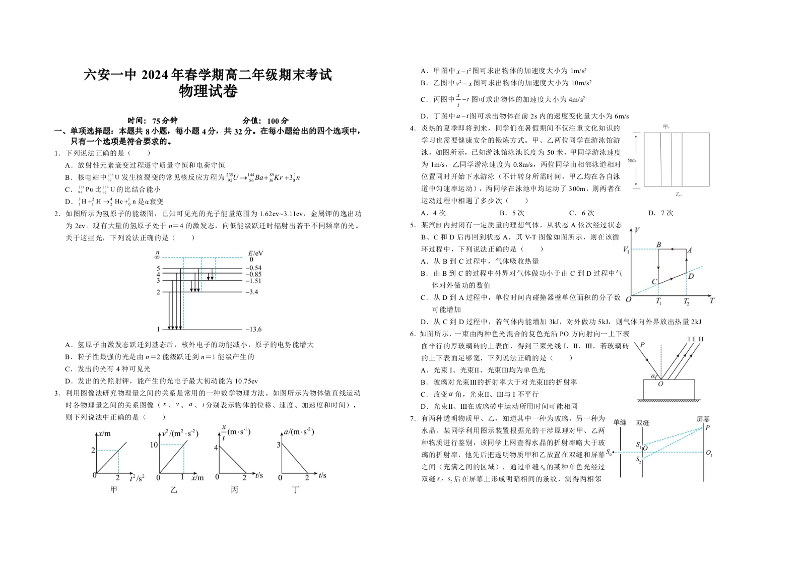 安徽省六安第一中学高2025届下学期7月期末考试物理+答案