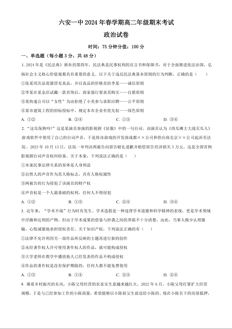 安徽省六安第一中学高2025届下学期7月期末考试政治+答案