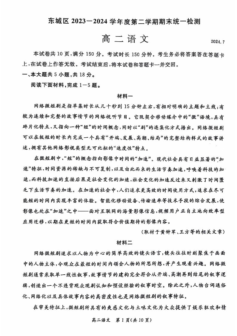 北京市东城区2023-2024学年度第二学期高二期末统一检测语文+答案