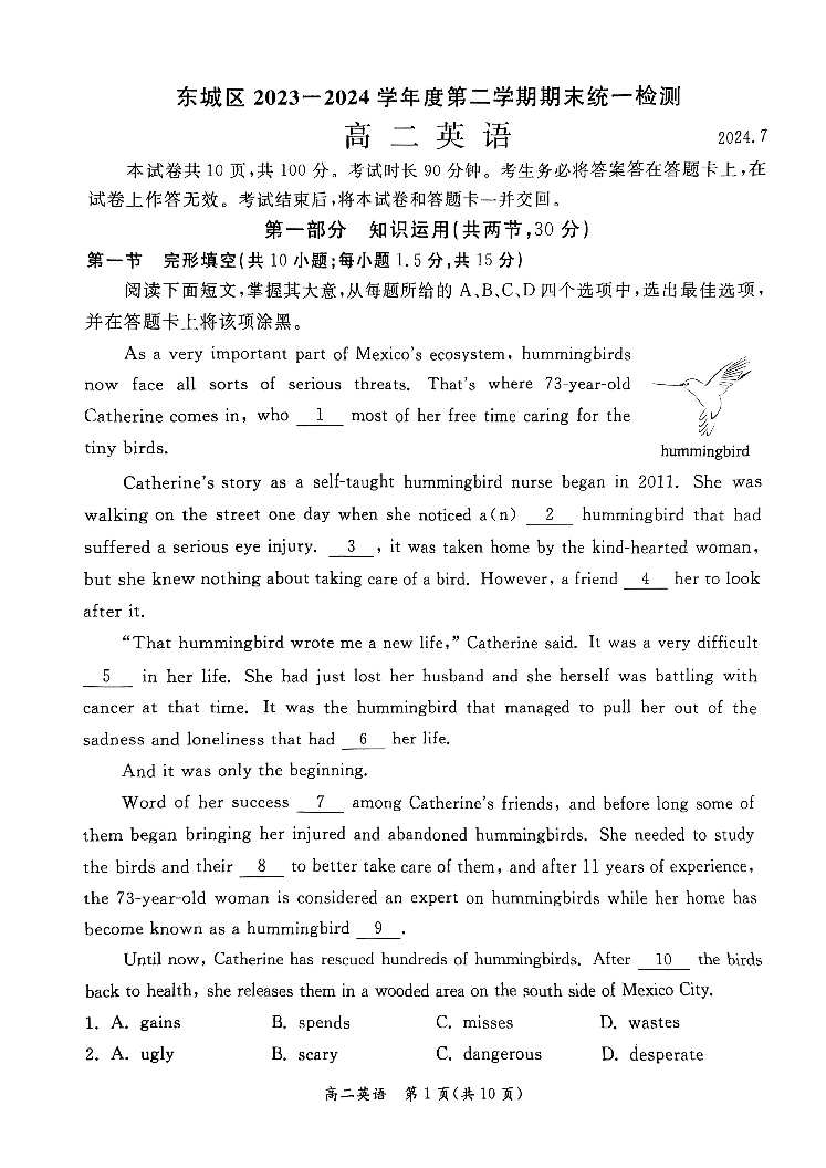 北京市东城区2023-2024学年度第二学期高二期末统一检测英语+答案