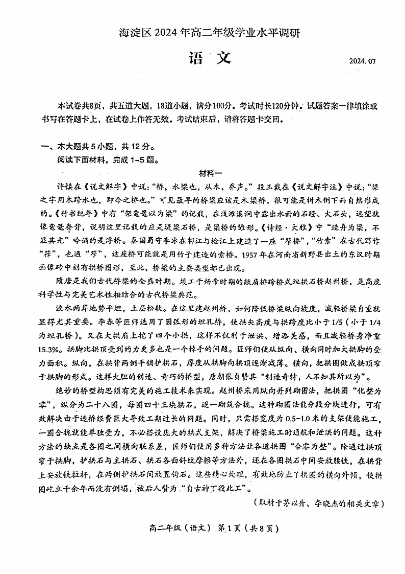 北京市海淀区高2025届下学期7月期末考试语文+答案