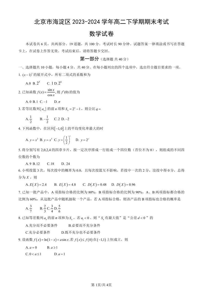 北京市海淀区高2025届下学期7月期末考试数学