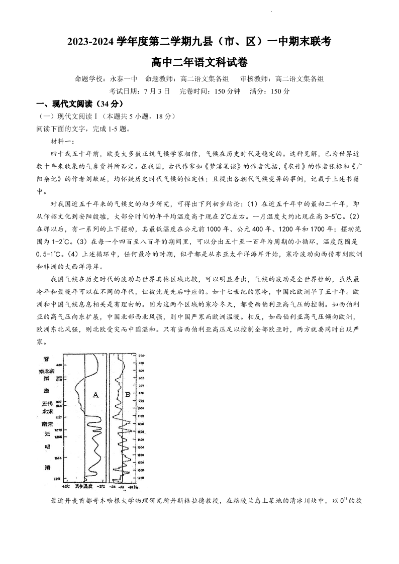 福建省福州市九县(市、区)一中高2025届下学期7月期末考试语文+答案