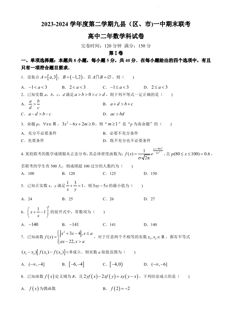 福建省福州市九县(市、区)一中高2025届下学期7月期末考试数学+答案