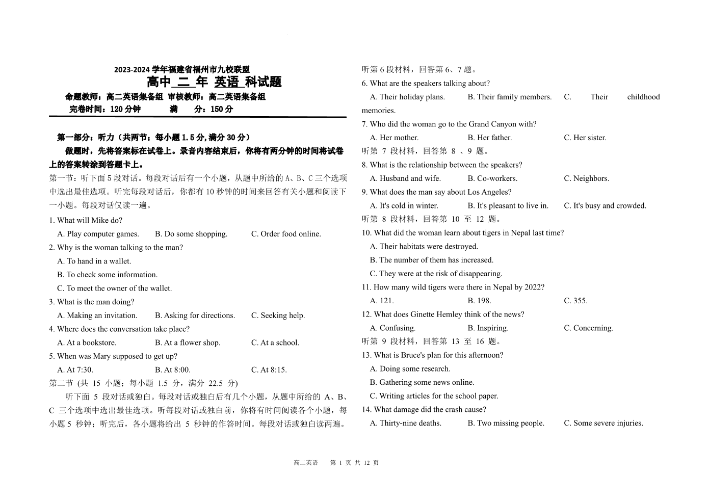 福建省福州市九县(市、区)一中高2025届下学期7月期末考试英语+答案