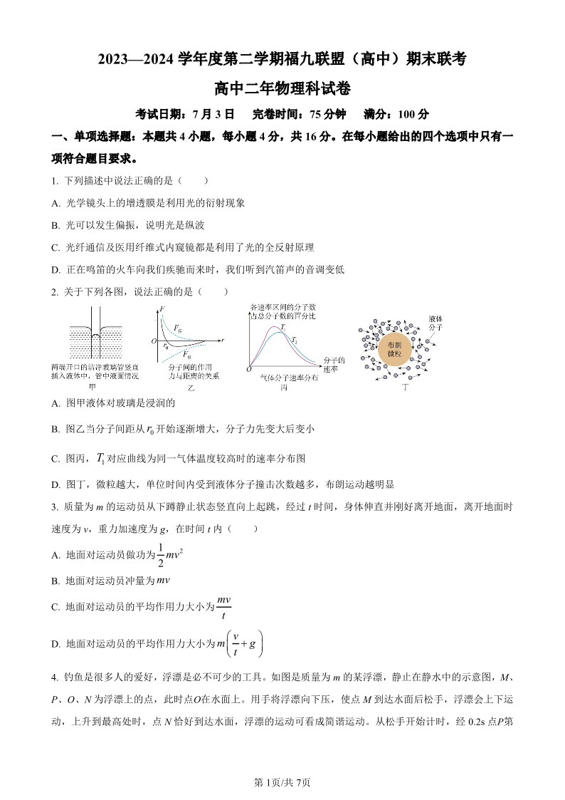 福建省福州市九县(市、区)一中高2025届下学期7月期末考试物理(原卷版)