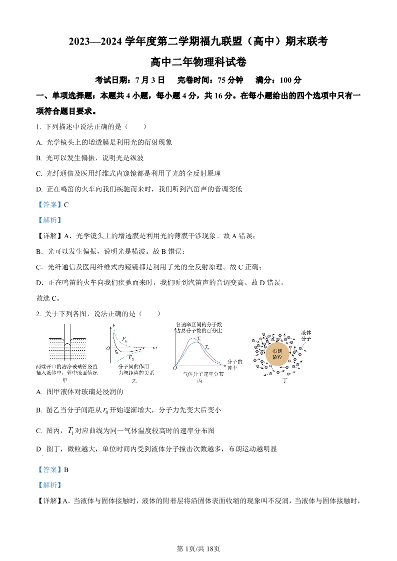 福建省福州市九县(市、区)一中高2025届下学期7月期末考试物理(精品解析版)