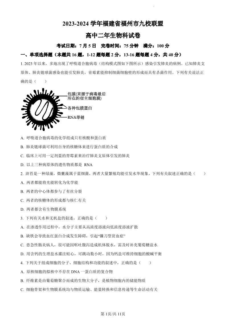 福建省福州市九县(市、区)一中高2025届下学期7月期末考试生物(原卷版)