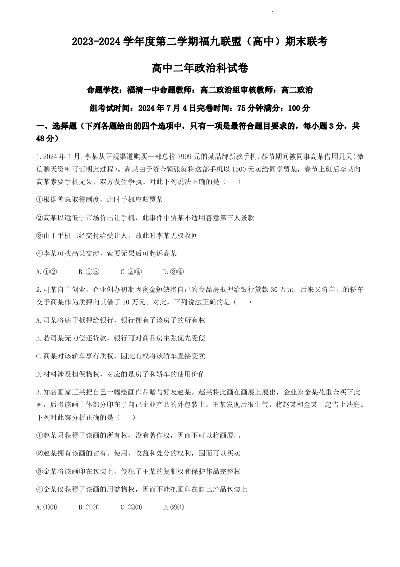 福建省福州市九县(市、区)一中高2025届下学期7月期末考试政治+答案