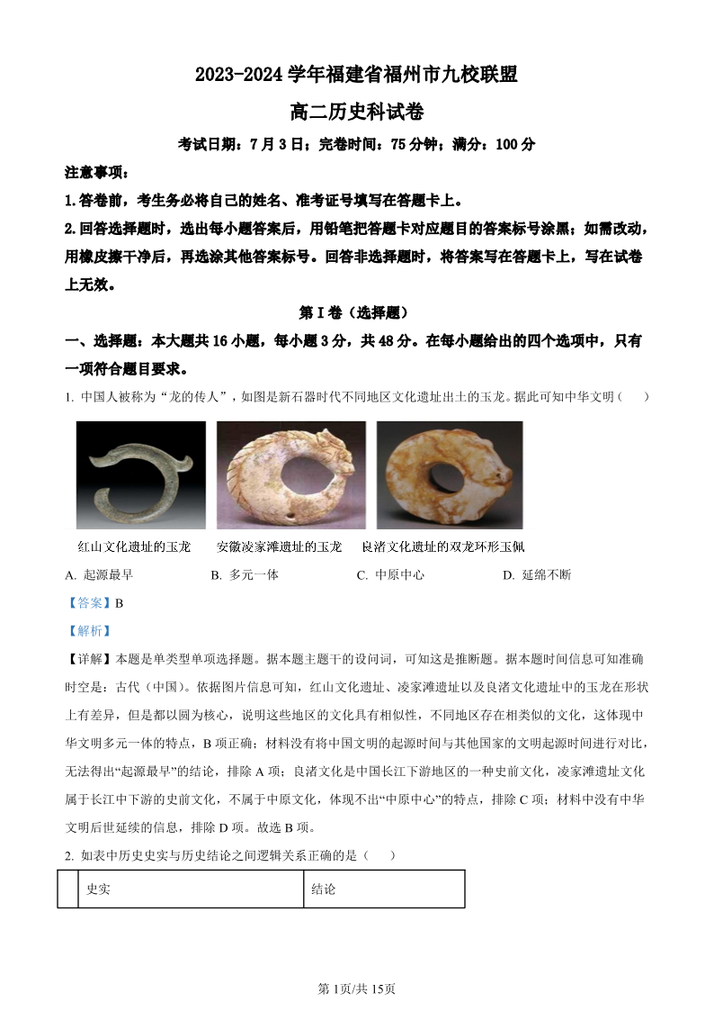 福建省福州市九县(市、区)一中高2025届下学期7月期末考试历史(精品解析版)