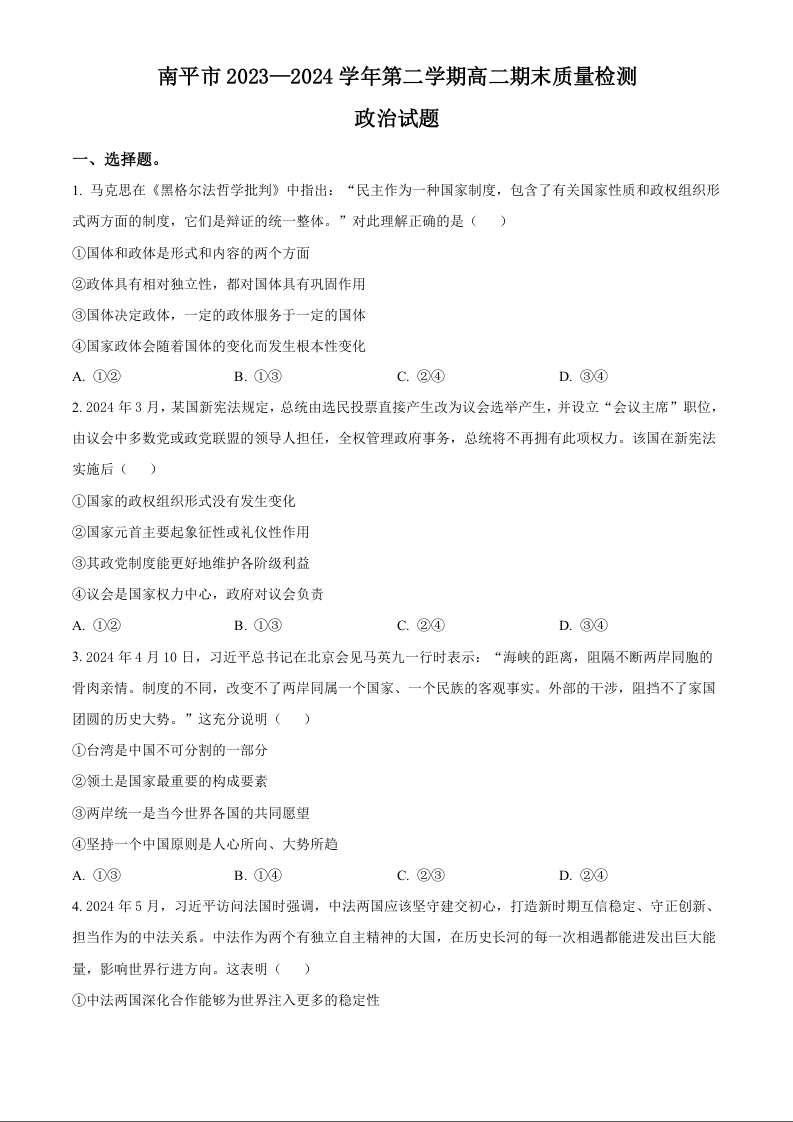 福建省南平市高2025届下学期7月期末考试政治+答案