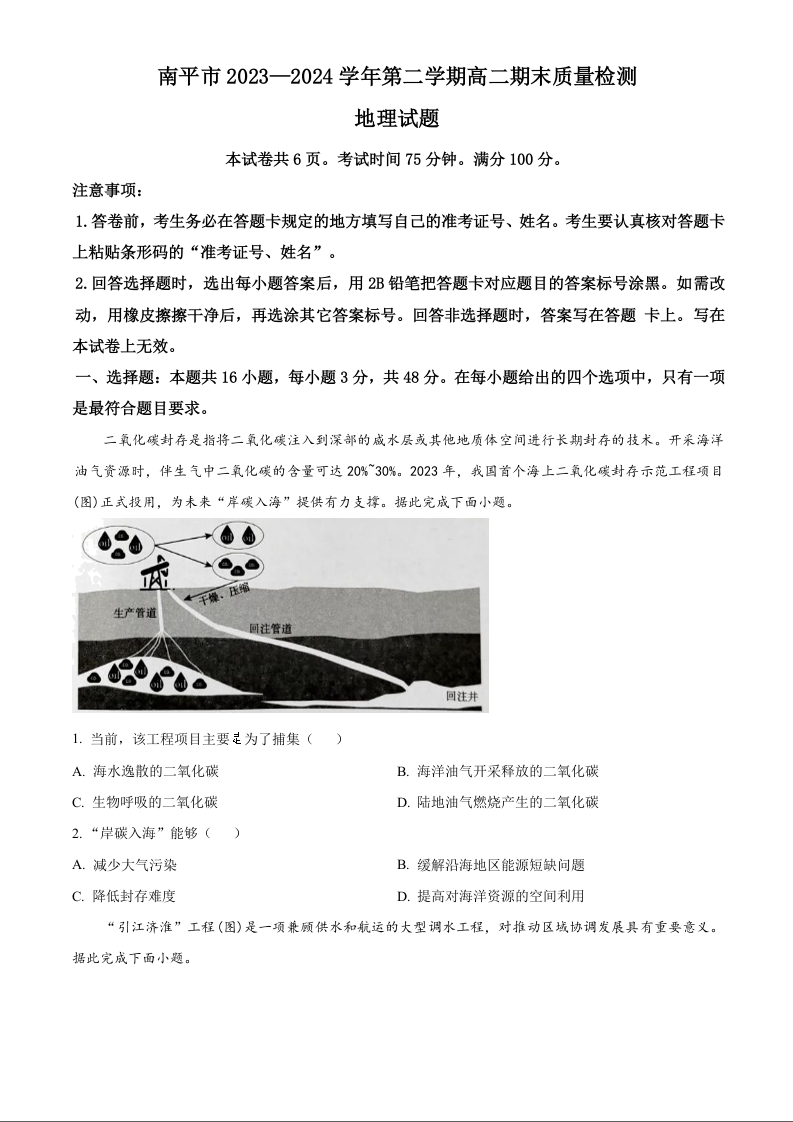 福建省南平市高2025届下学期7月期末考试地理+答案