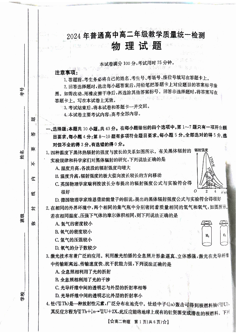 甘肃省普通高中高2025届下学期期末教学质量统一检测物理