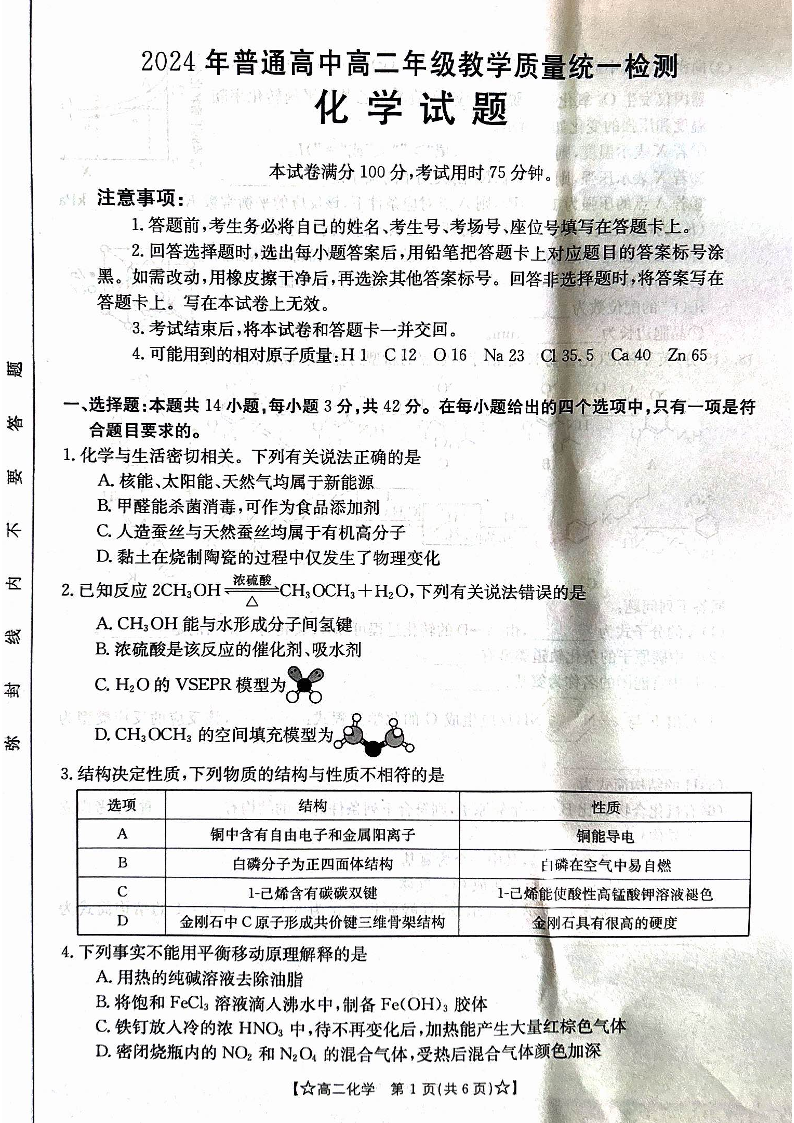 甘肃省普通高中高2025届下学期期末教学质量统一检测化学
