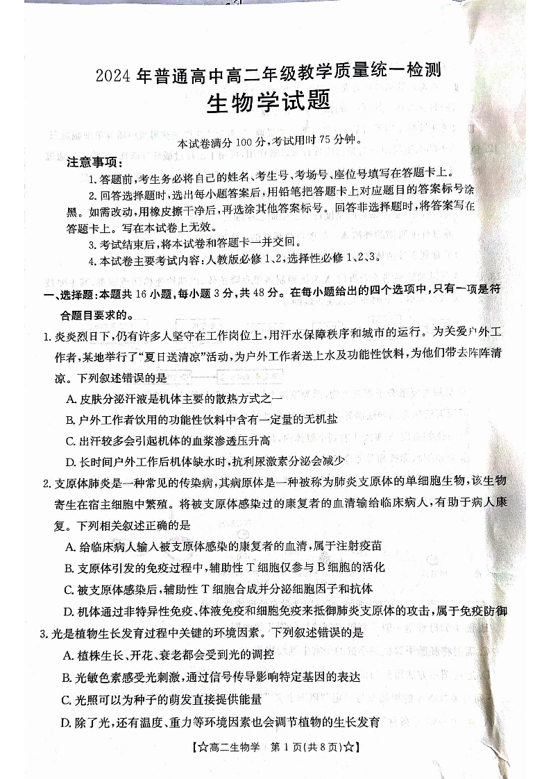 甘肃省普通高中高2025届下学期期末教学质量统一检测生物