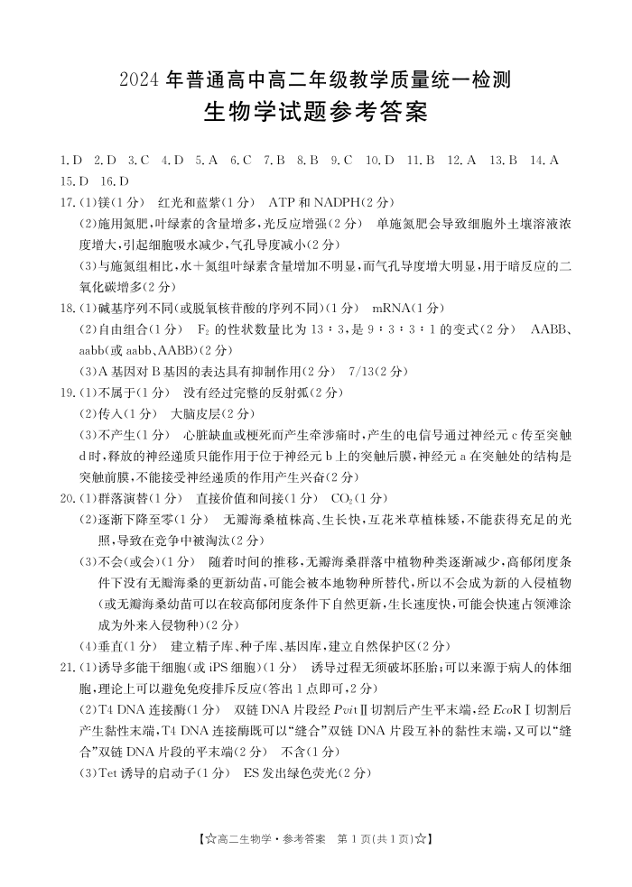 甘肃省普通高中高2025届下学期期末教学质量统一检测生物答案