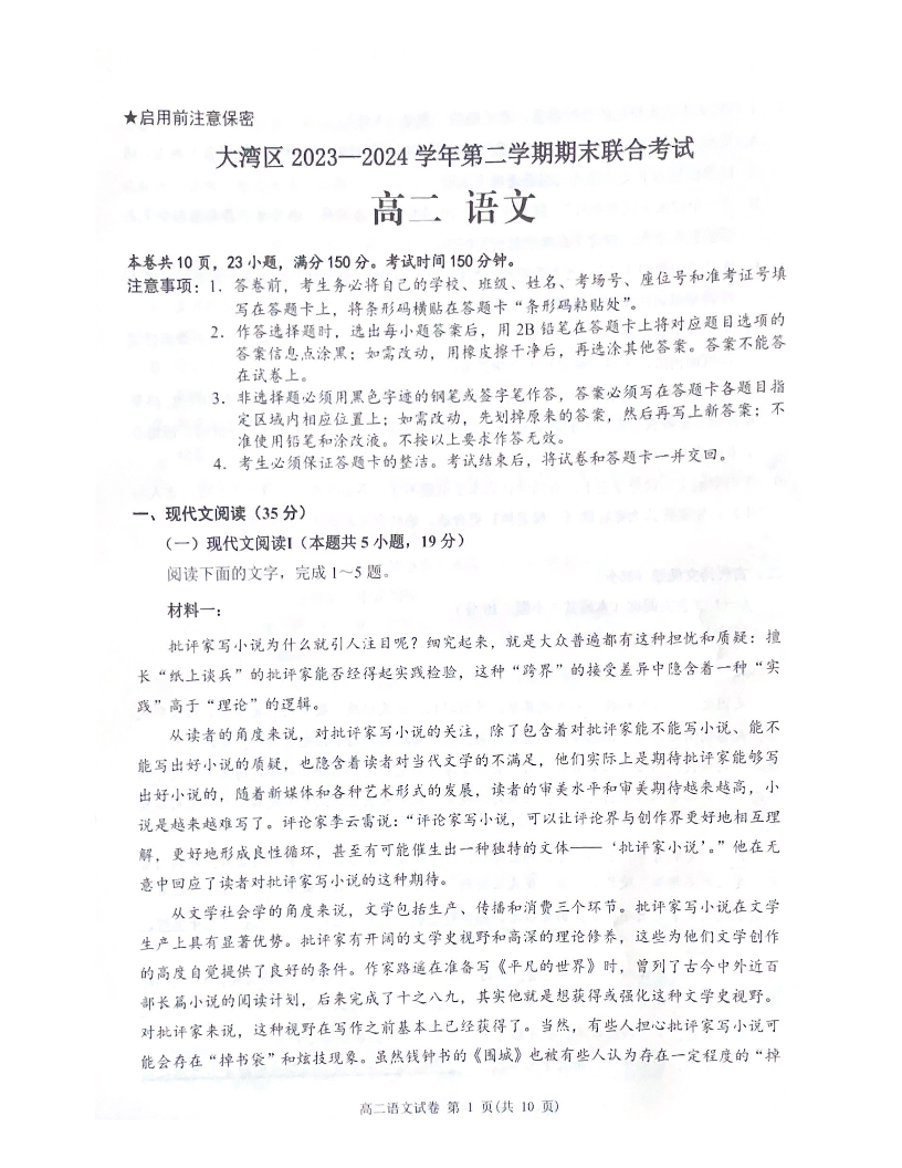 广东省大湾区2023—2024学年第二学期期末联合考试语文