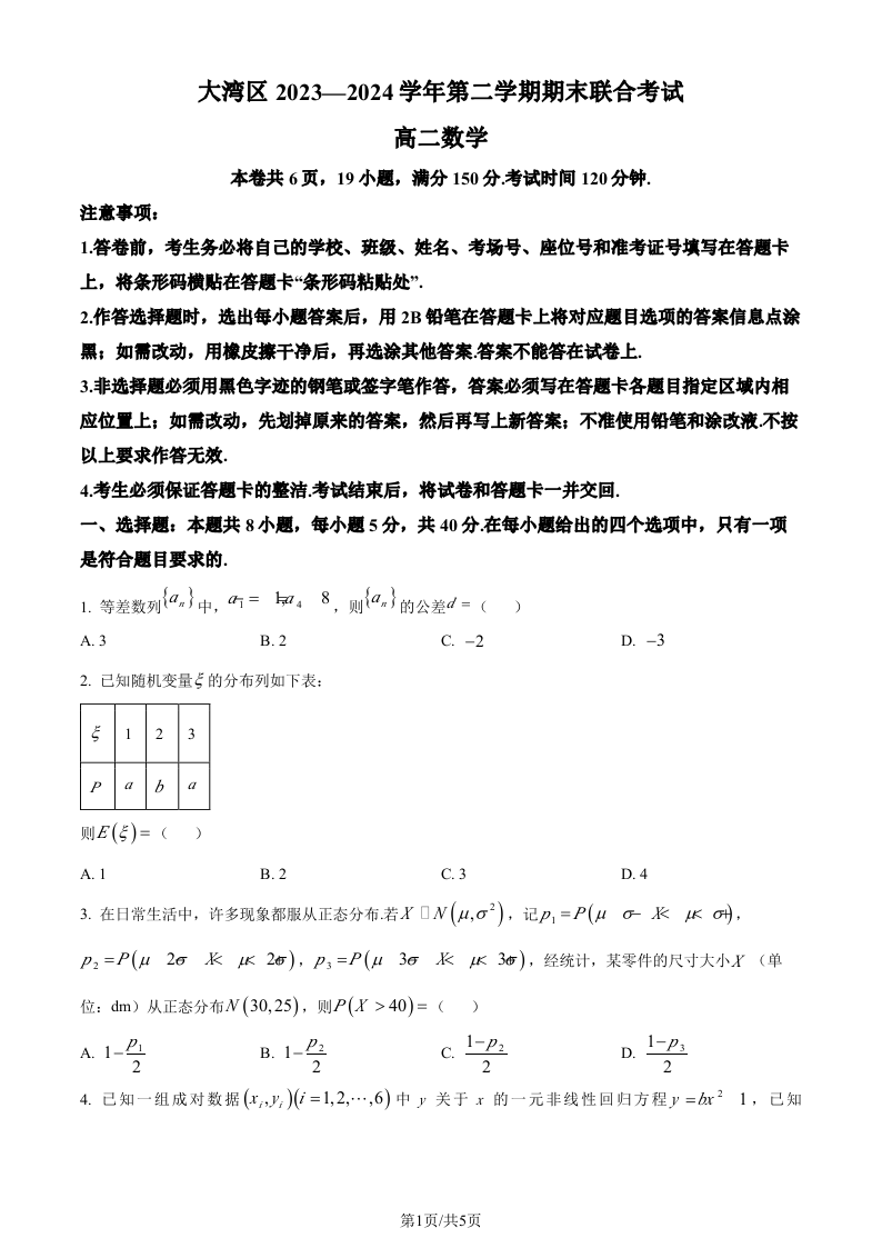 广东省大湾区2023—2024学年第二学期期末联合考试数学(原卷版)