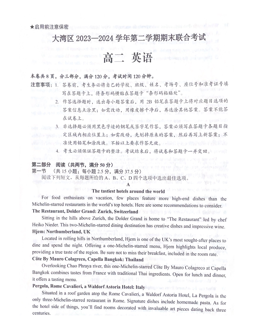 广东省大湾区2023—2024学年第二学期期末联合考试英语