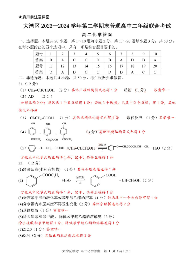 广东省大湾区2023—2024学年第二学期期末联合考试化学答案