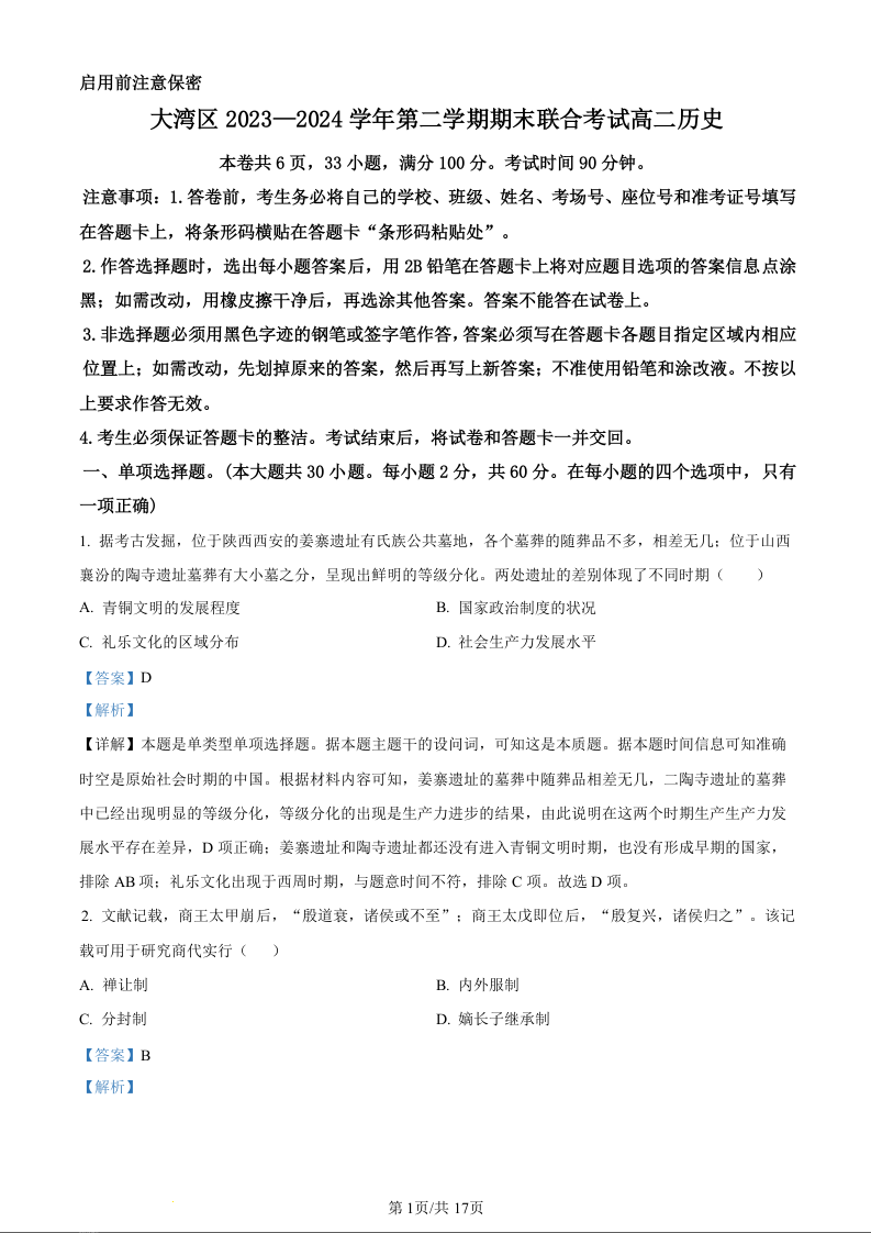 广东省大湾区2023—2024学年第二学期期末联合考试历史(精品解析版)