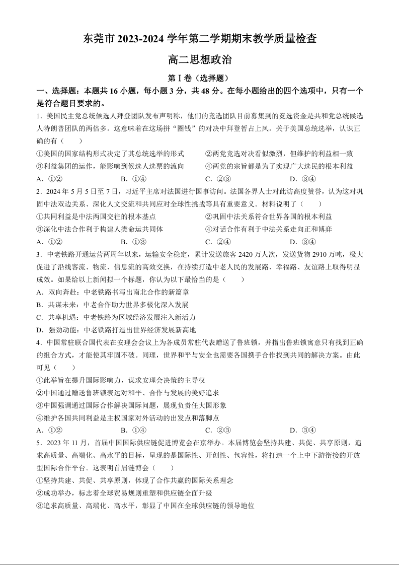 广东省东莞市高2025届下学期7月期末考试政治+答案
