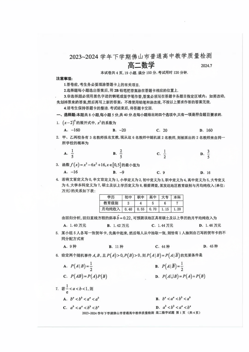 广东省佛山市高2025届下学期7月期末教学质量检测数学+答案