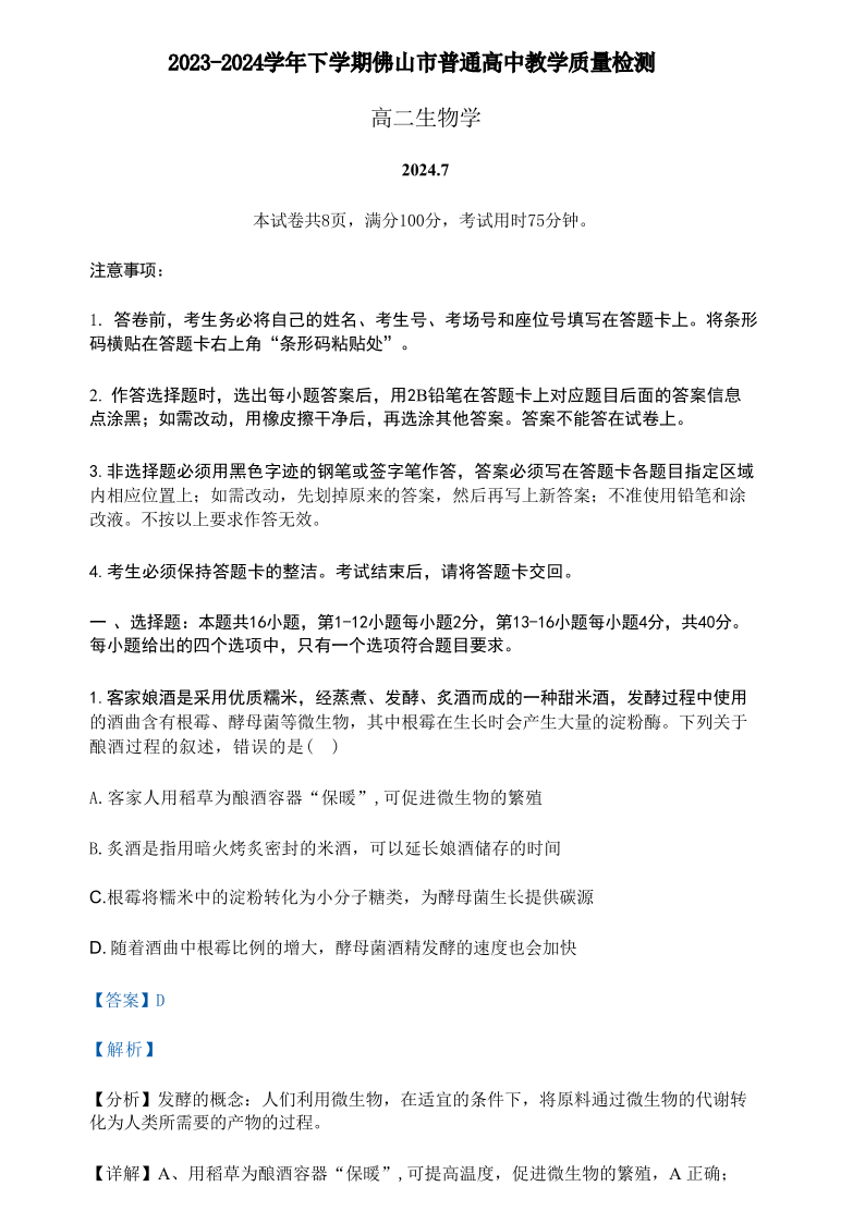 广东省佛山市高2025届下学期7月期末教学质量检测生物+答案