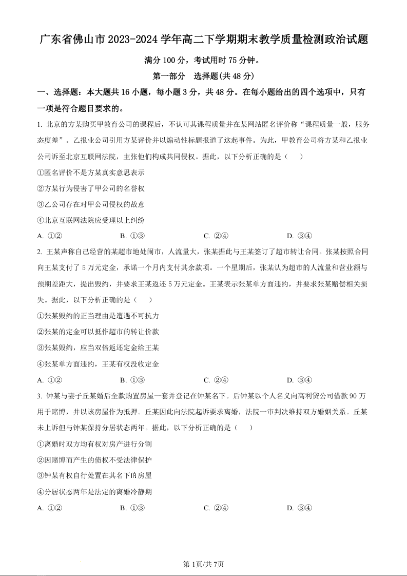 广东省佛山市高2025届下学期7月期末教学质量检测政治(原卷版)