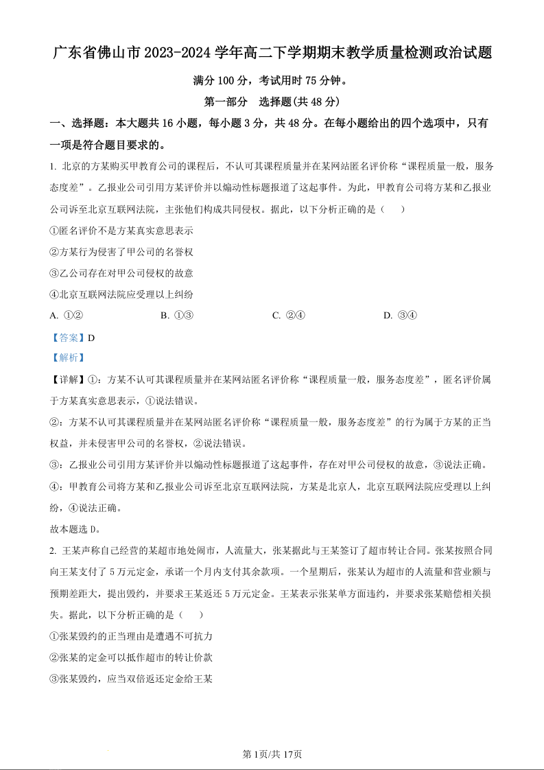 广东省佛山市高2025届下学期7月期末教学质量检测政治(精品解析版)