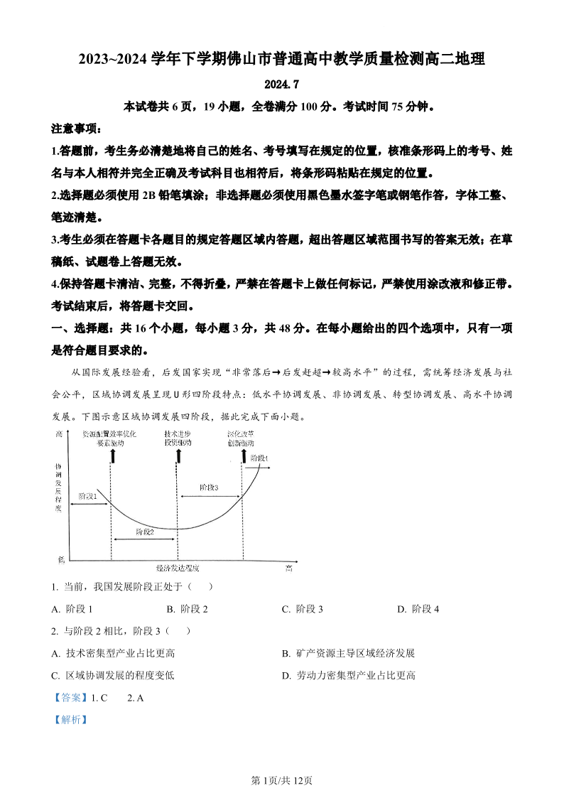 广东省佛山市高2025届下学期7月期末教学质量检测地理(精品解析版)