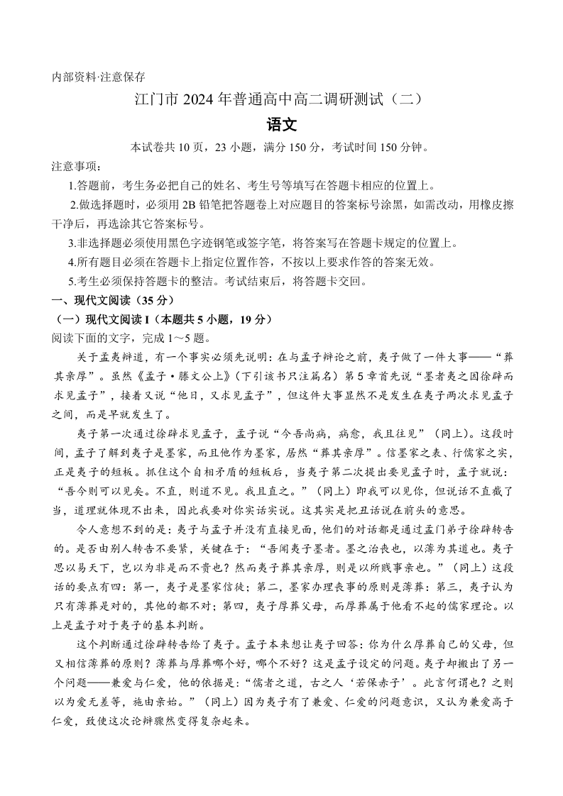 广东省江门市高2025届下学期7月期末考试语文+答案