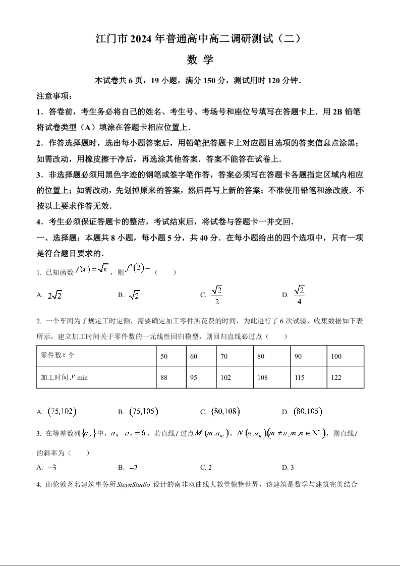 广东省江门市高2025届下学期7月期末考试数学+答案