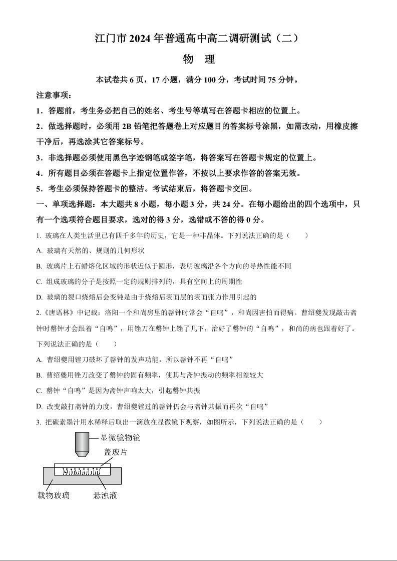 广东省江门市高2025届下学期7月期末考试物理+答案