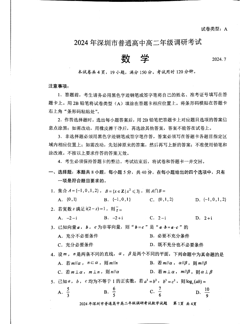 广东省深圳市高2025届下学期7月期末调研考试数学