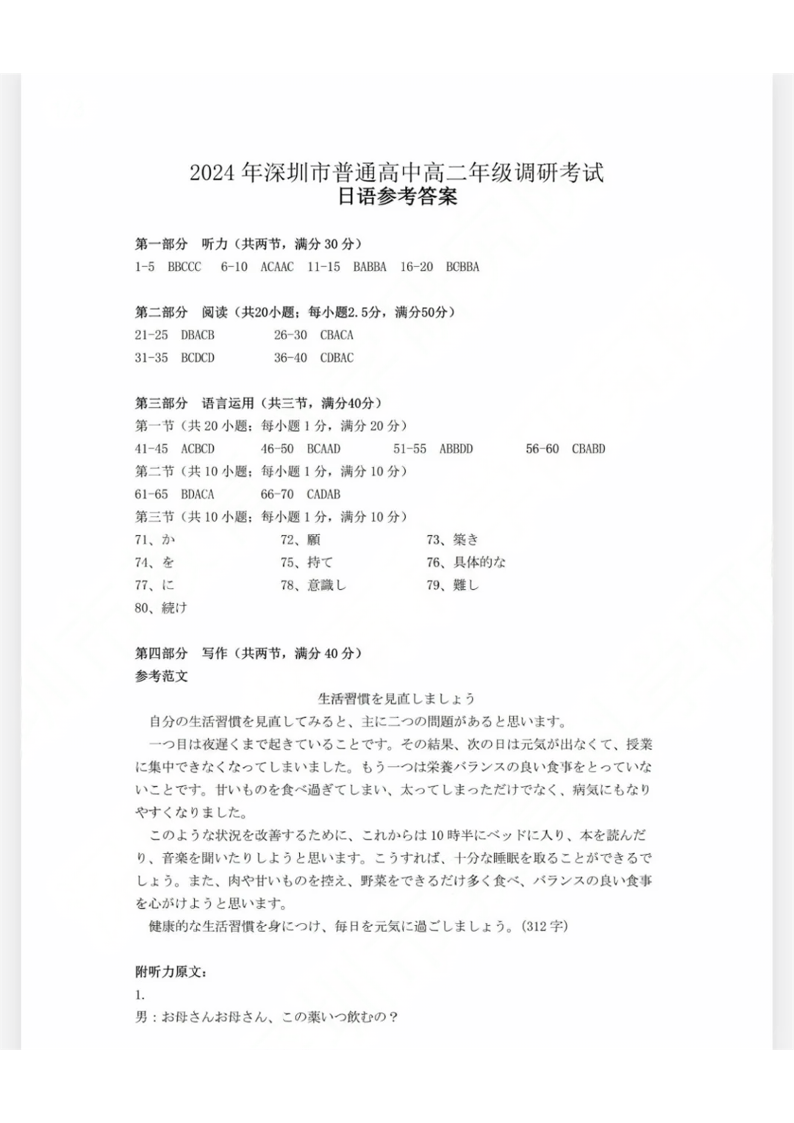 广东省深圳市高2025届下学期7月期末调研考试日语答案