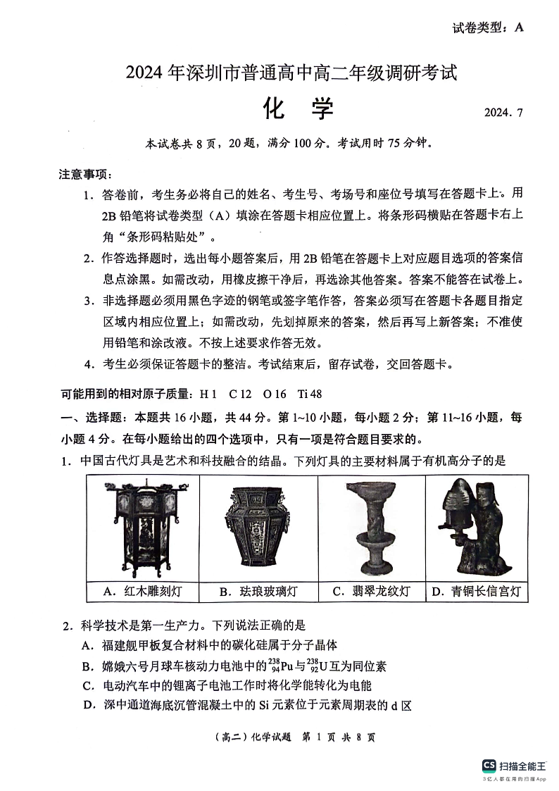 广东省深圳市高2025届下学期7月期末调研考试化学