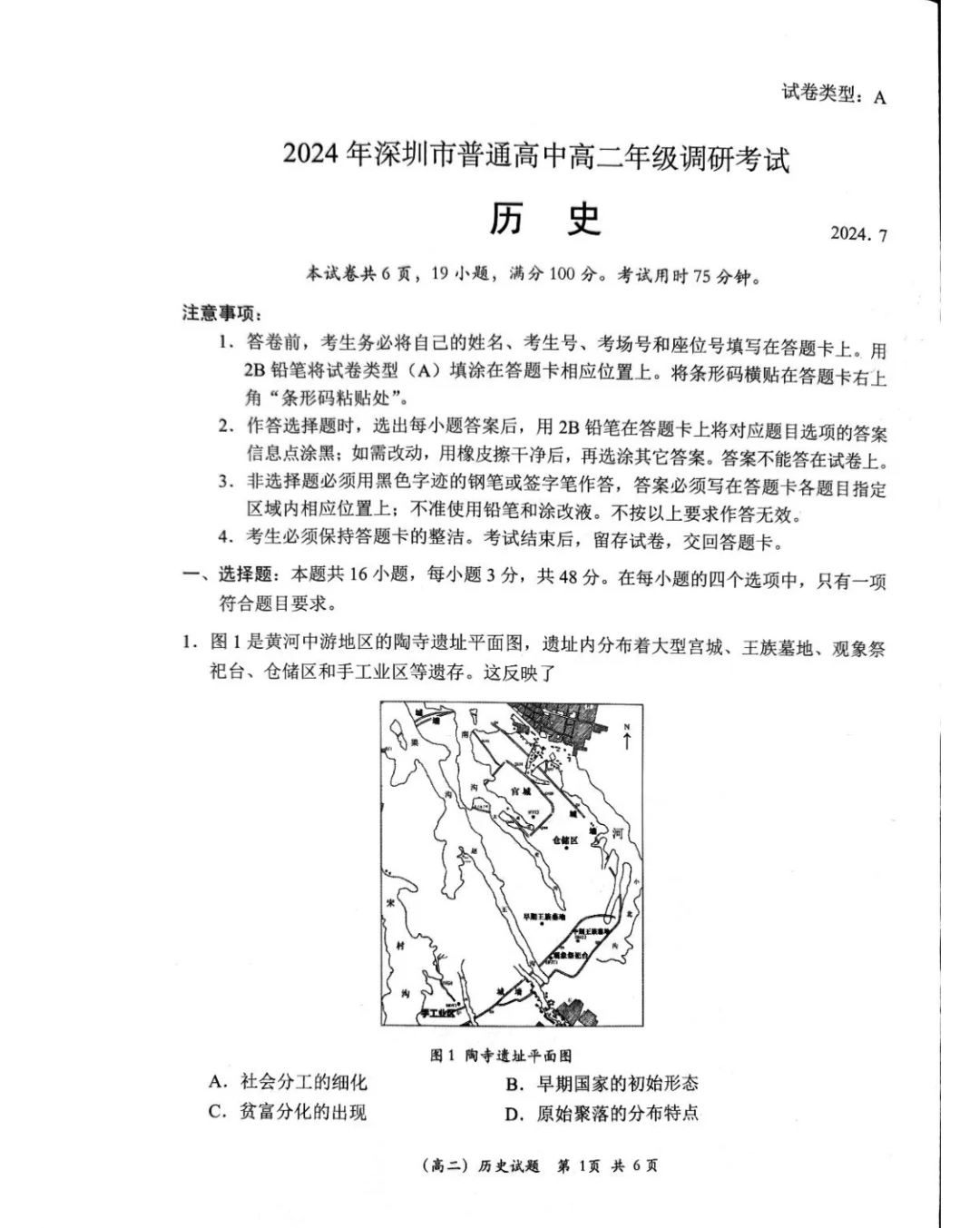 广东省深圳市高2025届下学期7月期末调研考试历史