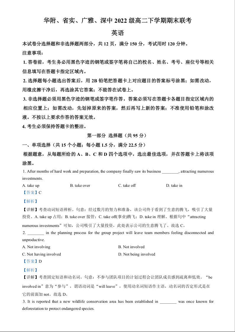 广东省四校(华附、省实、广雅、深中)高2025届下学期期末联考英语(精品解析版)