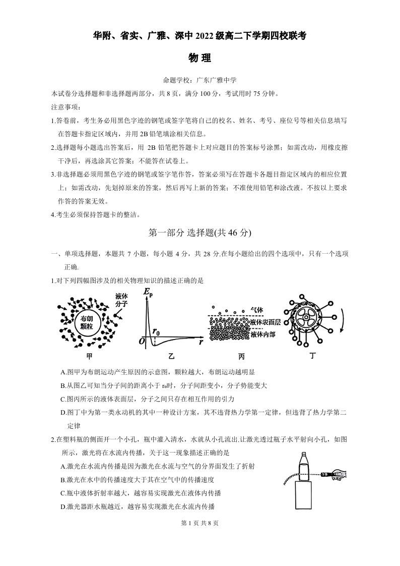 广东省四校(华附、省实、广雅、深中)高2025届下学期期末联考物理+答案