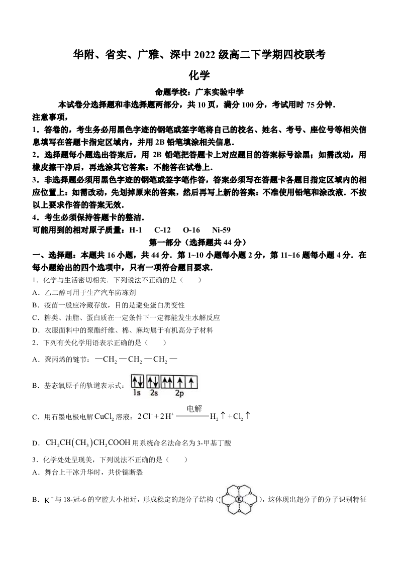 广东省四校(华附、省实、广雅、深中)高2025届下学期期末联考化学+答案