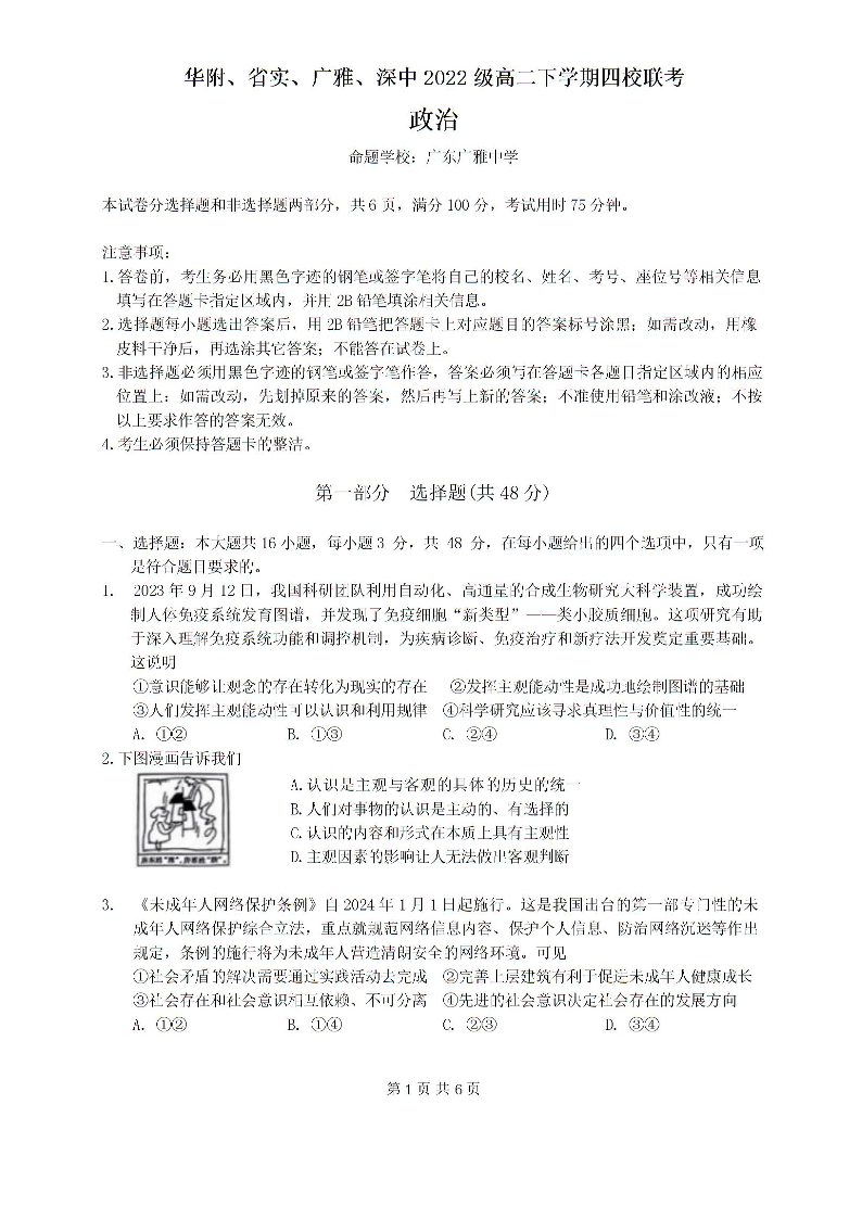 广东省四校(华附、省实、广雅、深中)高2025届下学期期末联考政治+答案