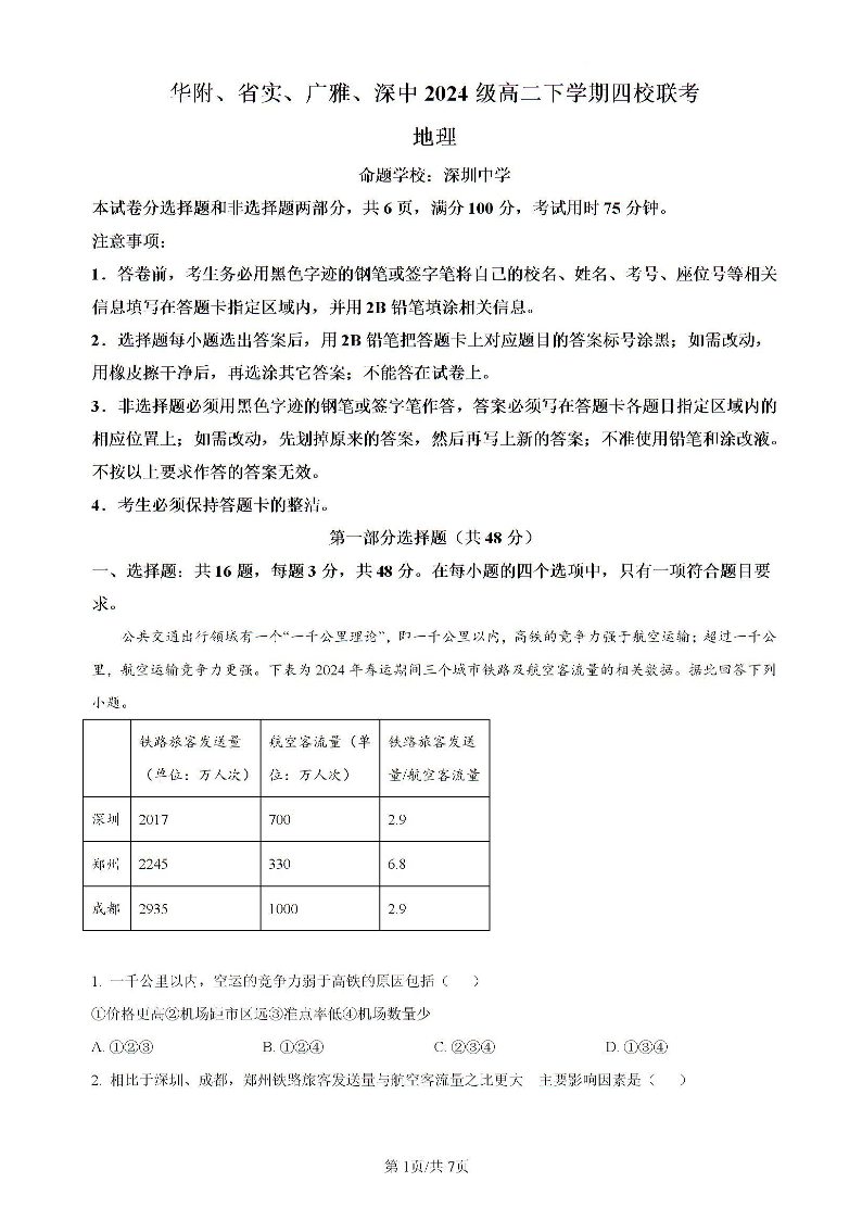 广东省四校(华附、省实、广雅、深中)高2025届下学期期末联考地理+答案