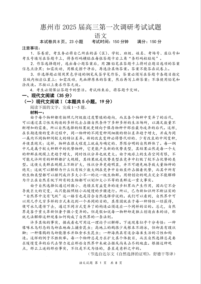 广东省惠州市2025届高三第一次调研考试语文