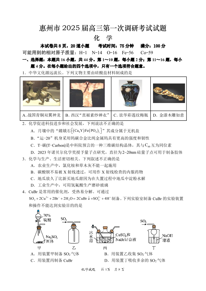广东省惠州市2025届高三第一次调研考试化学