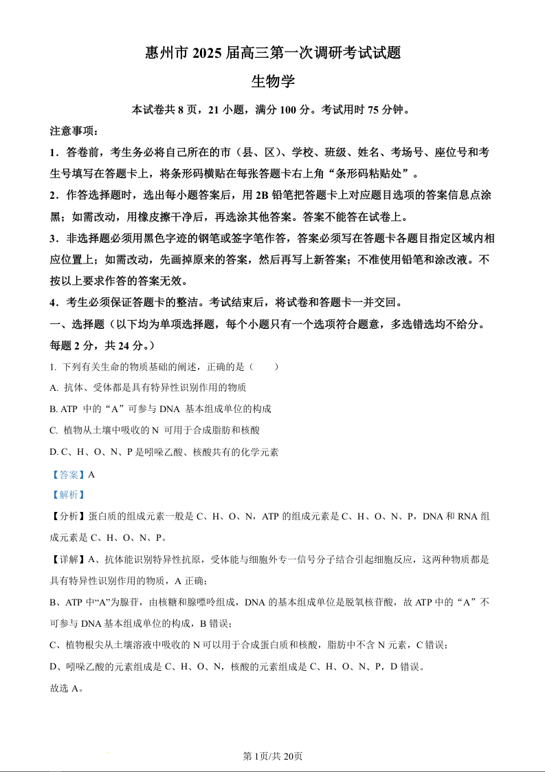 广东省惠州市2025届高三第一次调研考试生物(精品解析版)