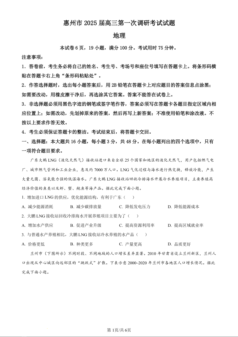 广东省惠州市2025届高三第一次调研考试地理(原卷版)