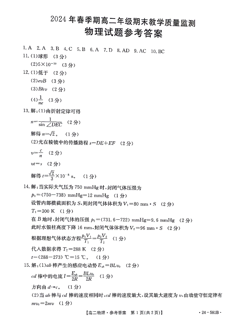 广西壮族自治区贵港市高2025届下学期期末教学质量监测物理答案