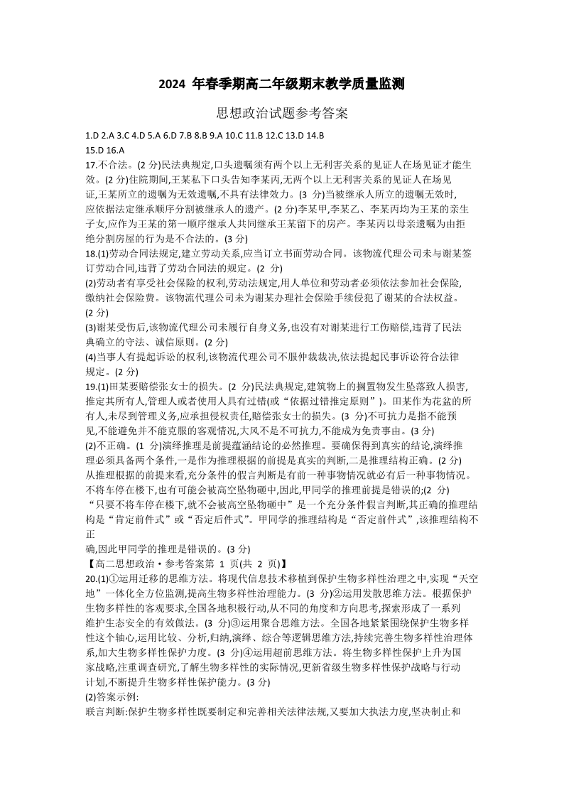 广西壮族自治区贵港市高2025届下学期期末教学质量监测政治答案