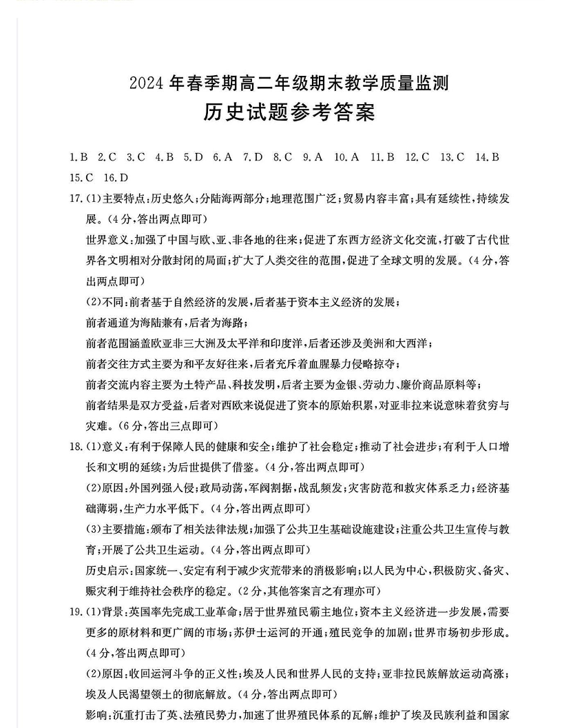 广西壮族自治区贵港市高2025届下学期期末教学质量监测历史答案